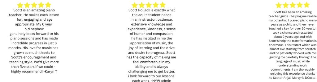 Whether you’re in Tuckahoe, Poughkeepsie, Ardsley, New Rochelle, New Paltz, White Plains, Nyack, Port Chester, Hawthorne, or Mt. Pleasant, Scott’s experienced on-line or in-home piano lessons are both convenient and effective